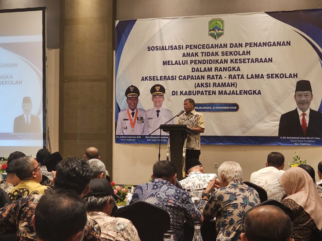 Penegasan ini disampaikan oleh Bupati Majalengka, H. Eman Suherman, saat membuka kegiatan Sosialisasi Pencegahan dan Penanganan ATS melalui Pendidikan Kesetaraan, bertempat di Hotel Fitra, Kamis (20/11/2025).